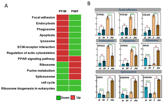 By comprehensive analyses of the differentially expressed protein enrichment pathways in two groups (M vs. PF and F vs. PM), we found that some common signaling pathways were significantly changed after sexual reversal in different directions in P. sinensis (Figure 5). These common signaling pathways may closely related to sex reversal. Partial common signaling pathways, such as focal adhesion, endocytosis, phagosome, apoptosis, lysosome, ECM-receptor interaction, and regulation of actin cytoskeleton, showed opposite trends after sexual reversal in two groups, in which the pathways were upregulated between M and PF, but downregulated between F and PM. The DAPs associated with the peroxisome proliferator activated receptor (PPAR) signaling pathway, which were both increased in two groups. In the F vs. PM group, the DAPs that enriched in the ribosome, purine metabolism, and spliceosome pathways were significantly downregulated, while they were upregulated in the M vs. PF group (Figure 5A).