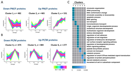 The cluster analysis was performed on the DAPs among the different gonad tissues, which showed the changes in DAPs in every group (Supplementary Figure S4B). The proteomic results were analyzed using fuzzy c-means clustering to classify the dynamic expression levels in the gonads of Chinese soft-shelled turtles under E2 or MT. The 2714 proteins that were differentially regulated in at least one type during induction by exogenous hormones were categorized into six distinct clusters, of which, the DAPs in clusters 1 and 4 were downregulated, while those in clusters 2–3 and clusters 5–6 were upregulated in the PM vs. F or PF vs. M groups (Figure 6A,B). GO enrichment analysis showed that the proteins in the six clusters were associated with different biological processes (Figure 6C). Cluster 1 (n = 482) was downregulated by MT and enriched in rRNA processing, chromatin assembly and disassembly, and RNA splicing. However, the proteins in clusters 2–3 (n = 996; upregulated between F and PM) were specifically related to transport and development, such as transmembrane transport and embryo development. The proteins in cluster 4 (n = 475; downregulated in M vs. PF) were enriched in peptide biosynthetic process, calcium ion transport, and catabolic process. The proteins in cluster 5–6 (n = 761; upregulated by E2 in PF vs. M) were enriched in the regulation of protein phosphorylation and steroid metabolic process.