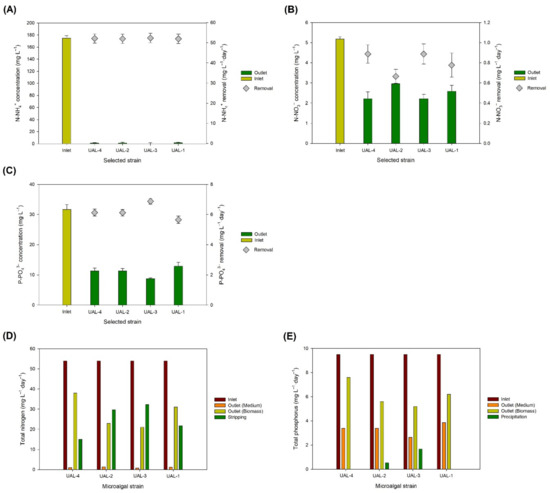 Regarding phosphorus (P-PO43−), the removal rates observed are shown in Figure 2C. The highest P-PO43− removal was achieved using UAL-3 at a rate of 6.8 mg·L−1·day−1, followed by a comparable removal rate of nearly 6 mg L−1day−1 for UAL-4, UAL-2, and UAL-1. Because of the high initial P-PO43− inlet concentration, the outlets still retained a relatively high P-PO43− concentration and did not comply with existing regulations, which set the maximum discharge limit at 1–2 mg·L−1 [31]. For this reason, it would be necessary either to decrease the dilution rate in order to increase the hydraulic retention time, and thus allow greater nutrient consumption, or to supplement the medium with N-NO3− so as to increase microalgal growth and therefore increase the P-PO43− uptake by the microalgal cells. It is important to note that the present study aimed to select one strain for large-scale production rather than to optimise the process. Process optimisation must be conducted independently for each photobioreactor design and location. This is possible because laboratory-scale photobioreactors are now suitable for wastewater treatment at the commercial scale. Nevertheless, incorrect pH control must be avoided, as it can cause phosphorus precipitation and reduced phosphorus availability, leading to lower biomass productivity. In this work, the pH in the reactors was monitored online and the phosphorus mass balance revealed that phosphorus precipitation was minimal. The mass balance was carried out assuming a phosphorus content in the biomass of 1.5%. Different microalgae have different compositions and, therefore, the results shown in Figure 2E are only an estimation. However, they demonstrate that the pH was correctly controlled, since low phosphorus precipitation (or even no precipitation) was observed, depending on the strain.