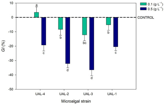 Effect of the microalgal extracts on the germination index of watercress seeds. Values represent the percentage of variation with respect to the control (distilled water). Values represent the mean values ± SD. Different letters indicate significant differences (p < 0.05).
