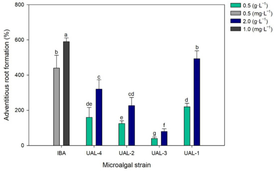 Effect of the microalgal extracts on the formation of adventitious roots. Values represent the percentage of variation with respect to the control (distilled water). Values represent the mean values ± SD. Different letters indicate significant differences (p < 0.05).