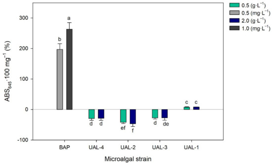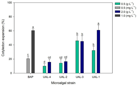 Cytokinins are another group of phytohormones that control not only cell division but also bud and leaf-blade development. The cytokinin-like activity of the extracts was assessed using the cucumber cotyledon expansion test. Figure 5 shows the cotyledon expansion when using microalgal extracts compared to the negative control (distilled water, 0%). The values obtained are higher than the control for all four strains. In the case of UAL-1 and UAL-3, the values were even higher than those obtained with the BAP hormone at 0.5 mg·L−1, being 32.3% and 45.9% higher than the negative control. The results suggest that the microalgal extracts have a biostimulant effect. For example, at a concentration of 2.0 g·L−1, the UAL-1 strain led to an increase of 60.9% compared to distilled water. The values were higher than those reported for other natural extracts, such as those obtained by Navarro-López et al. [33] using a commercial biofertiliser made from algae or from Scenedesmus obliquus biomass without any pretreatment. This might be because of more bioactive compounds having hormone-like activity, perhaps as a result of the strain produced or the culture medium, either of which might affect the biomass composition.