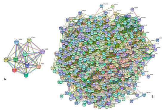 TLRs are involved in the interaction with each other (in fact, activation of these receptors is associated with their homo- and heterodimerization) and a multitude of human proteins. This is illustrated by Figure 2, which shows the internal and external protein–protein interaction (PPI) networks of these proteins. This analysis revealed that TLRs form a densely connected network, where, on average, each protein interacts with at least eight partners. The most connected are TLR1, TLR7, and TLR9, which are expected to interact with all of the remaining TLRs, and the least connected is TLR10, interacting with TLR1, TLR2, TLR3, TLR5, TLR7, and TLR9 (see Figure 2A). As a group, TLRs form an immense PPI network, where one can find 459 proteins (see Figure 2B). In line with these observations, STRING-based analysis of the interactivity revealed that individual TLRs are engaged in multiple PPIs (see Table S1 and corresponding plots in the Supplementary Figure S1).