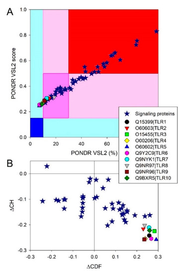 The global intrinsic disorder predisposition of human TLRs and major players in the TLR−triggered cellular pathways. (A) Analysis of 10 TLRs and 41 human proteins involved in TLR signaling based on the average disorder score (ADS) and percent of predicted disordered residues (PPIDR) as evaluated by PONDR® VSL2 [128]. Larger values of each parameter correspond to a larger disorder propensity. Different color blocks indicate regions containing proteins with different levels of ordered, where mostly ordered, moderately disordered, and mostly disordered proteins are located within the blue, pink, and red blocks, respectively. If the two parameters (ADS and PPIDR) agree, the corresponding part of the background is shown by a dark color (blue or pink), whereas the light blue and light pink reflect areas in which only one of these criteria applies. (B) CH–CDF plot for 10 human TLRs and 41 major players of the TLR-based signaling. Intrinsic disorder predisposition analysis of all proteins was conducted using RIDAO web crawler, which aggregates the outputs of six well-known disorder predictors: PONDR® VLXT [129], PONDR® VL3 [130], PONDR® VLS2 [131], PONDR® FIT [132], IUPred2 (Short), and IUPred2 (Long) [133,134], and also provides the mean disorder predictions for query proteins by averaging the outputs of these six predictors. The corresponding disorder profiles of all query proteins are shown in the Supplementary Figure S1. For each query protein, the predicted percentage of intrinsically disordered residues (PPIDR; i.e., percent of residues with disorder scores exceeding 0.5) was calculated based on the outputs of PONDR® VLS2, which is characterized by high predictive power, as evidenced by the results of the recently conducted ‘Critical assessment of protein intrinsic disorder prediction’ (CAID) experiment, where the tool was recognized as predictor #3 of the 43 evaluated methods [135]. Global disorder status of the query proteins was checked by a CH–CDF analysis [136,137,138,139] that combines the outputs of two binary predictors, the charge–hydropathy (CH) plot [51,140] and the cumulative distribution function (CDF) plot [136,140,141], to create a CH–CDF phase space, where proteins are classified as ordered (proteins predicted to be ordered by both binary predictors), putative native “molten globules” or hybrid proteins (proteins determined to be ordered/compact by CH, but disordered by CDF), putative native coils and native pre-molten globules (proteins predicted to be disordered by both methods), and proteins predicted to be disordered by CH-plot, but ordered by CDF.