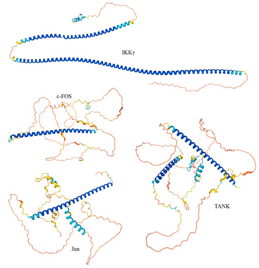 The 3D-structures modeled for human IKKγ, c-FOS, Jun, and TANK by AlphaFold [142]. Note the absence of the compact globular core in these proteins.
