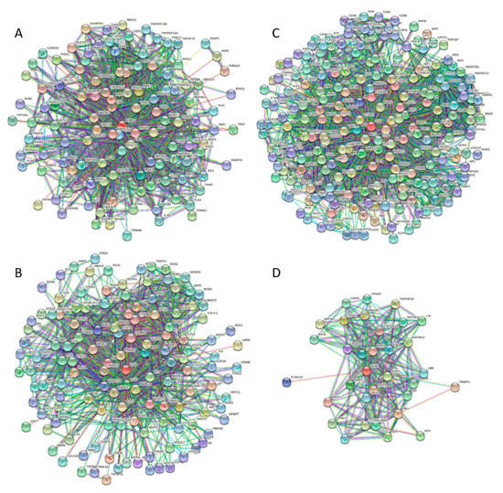 The fact that significant parts of these four proteins are predicted to be engaged in molecular recognition and undergo binding-induced disorder-to-order transition is further supported by Figure 7, which shows dense PPIs predicted for these four proteins by STRING. Each of these proteins represents a highly connected hub, indicating the heavy use of intrinsic disorder for PPIs. This is in line with previous studies that showed that intrinsic disorder is crucial for the functionality of hubs [52,159,160,161,162,163,164].
