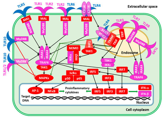 - Jenkins, K.A.; Mansell, A. TIR-containing adaptors in Toll-like receptor signalling. Cytokine 2010, 49, 237–244. [Google Scholar] [CrossRef] [PubMed]