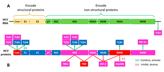 TLR7/8 can be activated by the HCV single-stranded RNA. It was shown that in the peripheral blood monocytes of the HCV-infected patients, the TLR7 expression was noticeably reduced due to the TLR7 gene distortion and instability of the TLR7 mRNA [197]. Furthermore, NS5A can inhibit the production of some inflammatory factors by binding to the MyD88 death domain, thereby suppressing TLR7/8 signaling [198,199] and affecting other MyD88-dependent pathways downstream of TLRs [20].