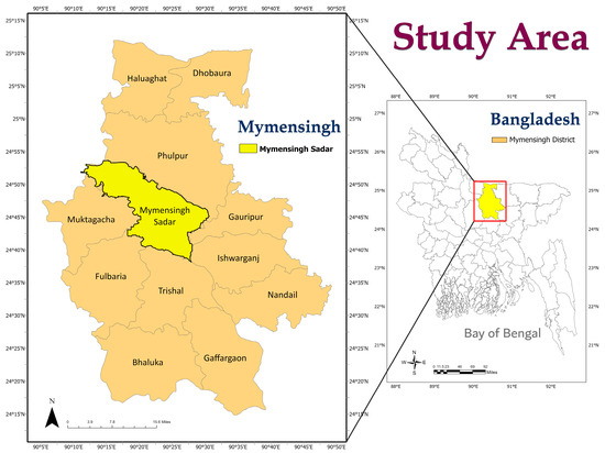 The present study was carried out in Mymensingh Sadar Upazila (24.7851° N, 90.3560° E), Mymensingh district of Bangladesh, between June 2021 and March 2022. The study area is featured in Figure 1.