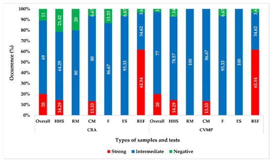 Occurrence of biofilm-producing S. aureus isolated from different foods and hand swabs, CRA = Congo Red Agar plating test, CVMP = Crystal Violet Microtiter Plate test, HHS = Human Hand Swab, RM = Raw Milk, CM = Chicken Muscle, F = Fish, ES = Egg Surface, REF = Ready-to-eat Food.