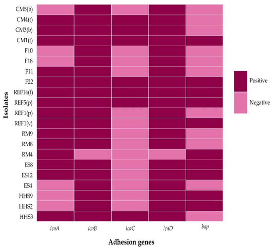 This study recorded that 21% (21/100) of the S. aureus isolates harbored at least one biofilm-producing gene involved in the synthesis of PIA, where there was no difference in the distribution patterns of the icaB and icaD genes in the biofilm-forming S. aureus isolates. Chen et al. [3] also reported that the distribution of icaB and icaD genes was similar; however, the bap gene was not detected in the S. aureus isolates. In addition, the prevalence rates of other biofilm-related genes observed in the current study varied greatly, which can be supported by different studies [41,42,43]. Multifarious gene expression patterns can be recorded when S. aureus isolates are subjected to various temperatures and contact surfaces for varying lengths of time [3].