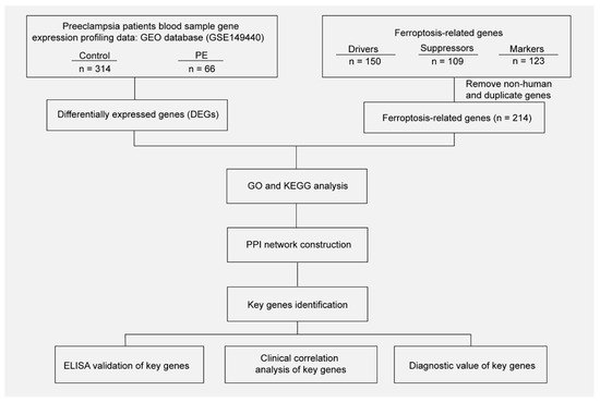 The National Center for Biotechnology Information (NCBI) Gene Expression Omnibus (GEO) database (https://www.ncbi.nlm.nih.gov/geo/ (accessed on 2 May 2022)) is an international open-access data platform. The gene expression profiling dataset GSE149440, which is based on the GPL28460 Affymetrix Human Transcriptome Array 2.0 platforms, was downloaded from GEO. The dataset contains 735 samples composing of whole blood from the controls who delivered at term (n = 314) and patients with early-preeclampsia (n = 66), preterm premature rupture of membranes (PPROM) (n = 189), and spontaneous preterm delivery (sPTD) (n = 166). The data of the controls and patients with early-preeclampsia were further analyzed. Three types of ferroptosis-related genes were download from FerrDb (http://www.zhounan.org/ferrdb/legacy/index.html (accessed on 2 May 2022)), including 150 drivers, 109 suppressors, and 123 markers. In total, 214 genes were screened after removing non-human and duplicate genes.