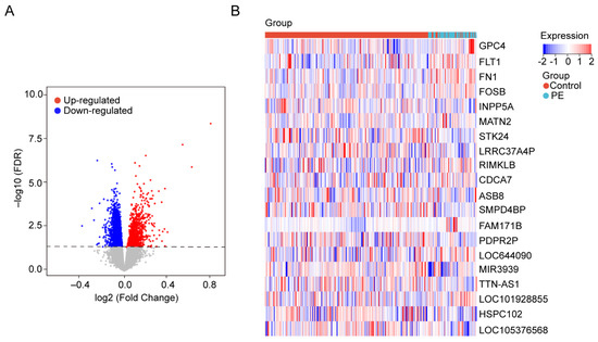 Identification of DEGs in the blood samples. (A) The volcanic maps. Red dots represent upregulated genes; blue dots represent downregulated genes, and gray dots represent no significance genes. (B) Heatmap for hierarchical clustering of DEGs in the control group and PE group.