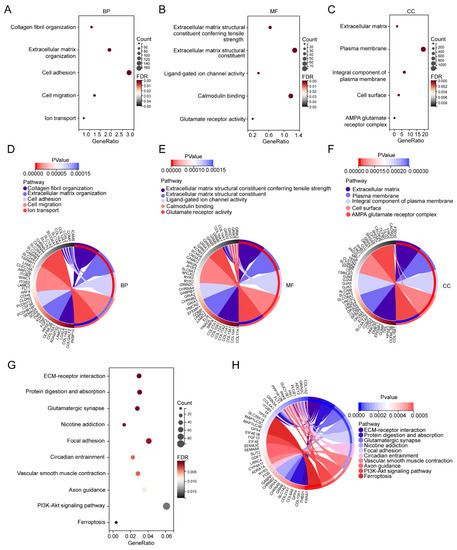 To investigate the biological functions of these DEGs, GO enrichment analysis was performed. The GO enrichment analysis results for the biological process (BP) showed that DEGs were mainly enriched in collagen fibril organization, extracellular matrix organization, cell adhesion, cell migration, and ion transport (Figure 3A,D). Extracellular matrix structural constituent conferring tensile strength, extracellular matrix structural constituent, ligand-gated ion channel activity, calmodulin binding, and glutamate receptor activity were enriched in Molecular Function (MF) (Figure 3B,E). For cellular component (CC), the DEGs were mainly enriched in the extracellular matrix, plasma membrane, integral component of plasma membrane, cell surface, and AMPA glutamate receptor complex (Figure 3C,F). The KEGG pathway found that the DEGs were mainly enriched in the ECM–receptor interaction, protein digestion and absorption, glutamatergic synapse, nicotine addiction, focal adhesion, circadian entrainment, vascular smooth muscle contraction, axon guidance, PI3K-Akt signaling pathway, and ferroptosis (Figure 3G,H).