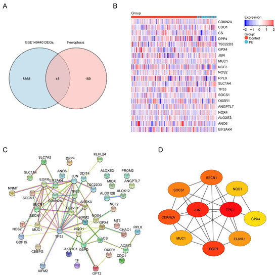 Identification of the ferroptosis-related DEGs and the identification of candidate ferroptosis-related hub genes in the blood samples of PE. (A) Venn diagram of the ferroptosis-related DEGs. (B) Heatmap depicting the expression levels of the top 20 ferroptosis-related DEGs. (C) PPI network analysis of the ferroptosis-related DEGs. (D) Ten hub genes were selected by the CytoHubba plug-in in Cytoscape.