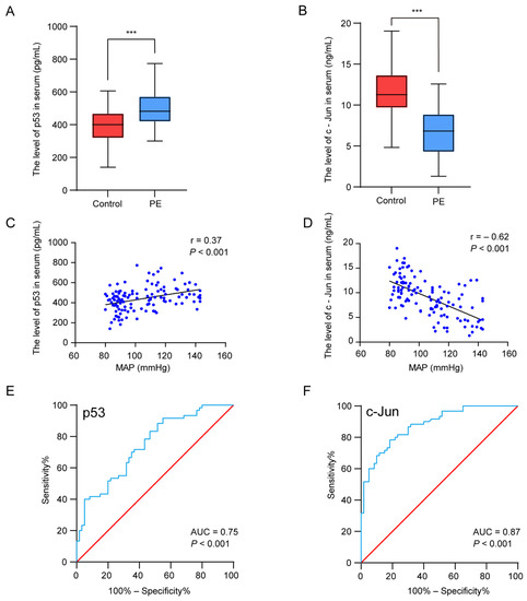 Experimental verification of the two hub genes, correlation analysis between the hub genes’ expression levels and clinical features, and the diagnostic accuracy analysis. (A,B) The concentration of p53 (A) and c-Jun (B) in serum. (C,D) Pearson correlation plots between MAP and p53 (C) and c-Jun (D). (E,F) The ROC curves were plotted to examine the diagnostic potential of p53 (E) and c-Jun (F). *** p < 0.001.