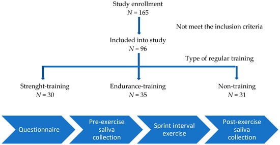 - Allgrove, J.E.; Gomes, E.; Hough, J.; Gleeson, M. Effects of exercise intensity on salivary antimicrobial proteins and markers of stress in active men. J. Sports Sci. 2008, 26, 653–661. [Google Scholar] [CrossRef] [PubMed]