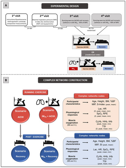 Panel A.Experimental design. First and second visits were conducted for sample characterization and familiarization. Additionally, the maximal inspiratory pressure (MIP) and global strength index of inspiratory muscles (SI) were measured. Exercise (all-out in tethered running, AO30) and recovery (both, without or with inspiratory muscle pre-activation (IMPA)) were conducted at the third and fourth randomized visits, separated by 48–72 h. Panel B. Scenarios for constructing the complex networks and complex network nodes used in these four scenarios. Legend: AO30 = all-out 30 s, IMPA = inspiratory muscle pre-activation, BM = body mass, %BF = percentage of body fat, MIP = maximal inspiratory pressure, SI = global strength index of inspiratory muscles, Lac = blood lactate, HR = heart rate, SpO2 = arterial oxygen saturation, RPE = perceived exertion, D = delta between final and initial results, BB = biceps brachii, VL = vastus lateralis, O2Hb = oxyhemoglobin relative concentration, HHb = deoxyhemoglobin relative concentration, tHb = total hemoglobin, TSI = tissue saturation index.