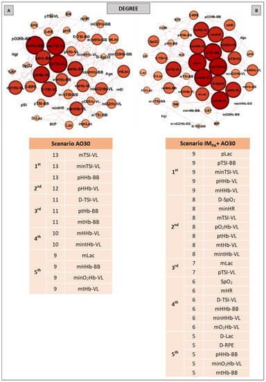 The results of the Degree metric in an exercise context are expressed in Figure 2. Thirteen nodes were highlighted in the first scenario (without IMPA); a high number of connections (13 links for the first nodes) and the important participation of muscle oxygenation responses for both BB and VL were visualized (Panel A). In the exercise preceded by IMPA (Panel B), 25 nodes assumed the top five ranking, with special attention given to the peak blood lactate and muscle oxygenation responses in VL. In this scenario, HR and SpO2 also appear on the top five list.