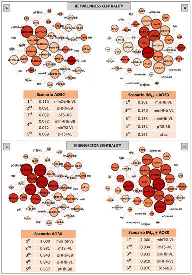 Figure 3 shows the results of the Betweenness centrality (Panels A, B) and Eigenvector metrics (Panels C, D) obtained in the AO30 exercise, without or with IMPA application. For the Betweenness, in the exercise without IMPA (Panel A), minimum oxyhemoglobin in VL and many parameters in BB assumed the main positions. When IMPA was applied (Panel B), the main returned nodes were related to muscle oxygenation in VL, and the peak blood lactate once again appeared in the top five ranking. For the Eigenvector metric, only muscle oxygenation responses in both muscles configured the top five nodes in the exercise without the IMPA scenario (Panel C). IMPA increased the values of this metric and modified the main players (Panel D). In this last case, TSI and HHb in VL assumed the first node positions.
