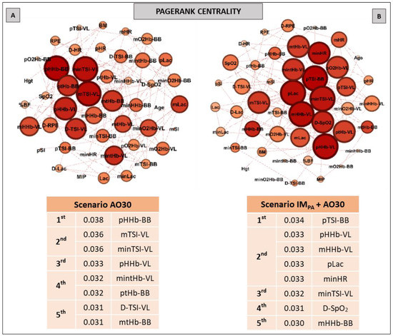 Pagerank was the last centrality metric adopted for the investigation of the IMPA influence on exercise by network analysis (Figure 4). According to this metric, the top five nodes in the non-IMPA (Panel A) exercise scenario were composed of muscle oxygenation responses in VL and BB. After IMPA, the exercise scenario was modified (Panel B), and pLac and minHR figured within the main nodes for the Pagerank—both in second place.