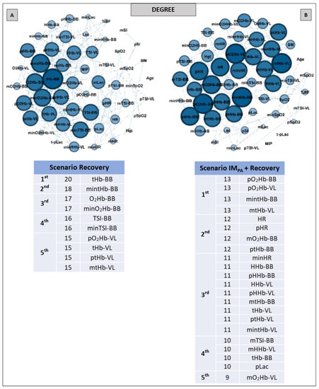 With regard to the Degree metrics, all of the nodes that appeared as top five in the recovery exercise scenario without IMPA were associated with muscle responses, especially in BB, considering the less active muscle in the AO30 running exercise (Figure 5, Panel A). For example, the most significant node in this scenario was the total hemoglobin in BB, with 20 connections. In contrast, in the IMPA + recovery scenario, we observed the increase in the number of nodes completing the top five list (10 versus 22 nodes, in Panels A and B, respectively), with HR and pLac figuring as important roles in this centrality metric.