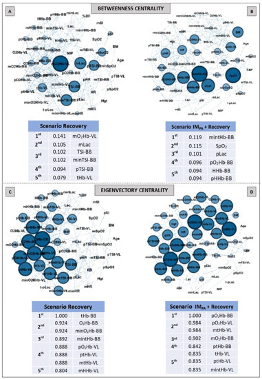 The Betweenness and Eigenvector results are expressed in Figure 6 (Panels A–D). Muscle oxygenation (in BB and VL) and mean blood lactate were set in the top five in the recovery scenario (Figure 6, Panel A). When IMPA was applied, there was a modification in the main nodes for this metric. SpO2 and pLac assumed the second and third most important places in this scenario, and only BB muscle responses were highlighted (Figure 6, Panel B). For the Eigenvector metric, only oxyhemoglobin, deoxyhemoglobin and total hemoglobin in BB and VL characterized the top five ranking for both scenarios, showing similar metric values and a similar number of nodes in two cases.