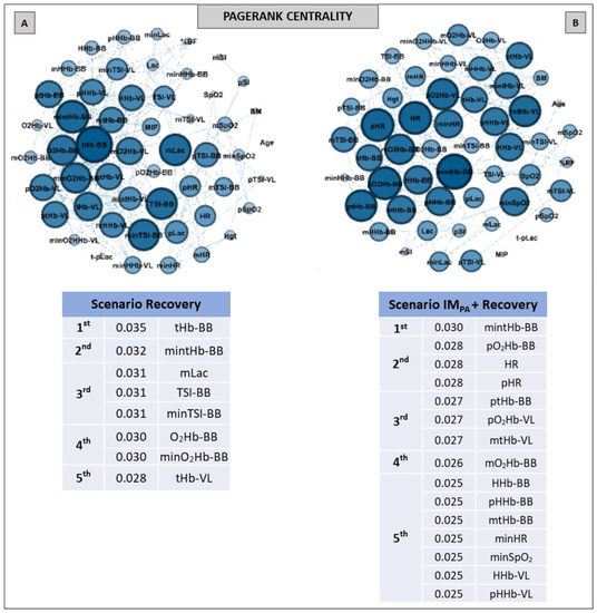 The graphs and table with the main nodes observed by the Pagerank metric in the recovery scenarios are shown in Figure 7. The differences observed for this metric in two recovery scenarios were the higher number of nodes and the appearance of the physiological measurements (HR, SpO2 and Lac) in the top five ranking in Panel B compared to Panel A (i.e., in the recovery after the exercise preceded by IMPA).