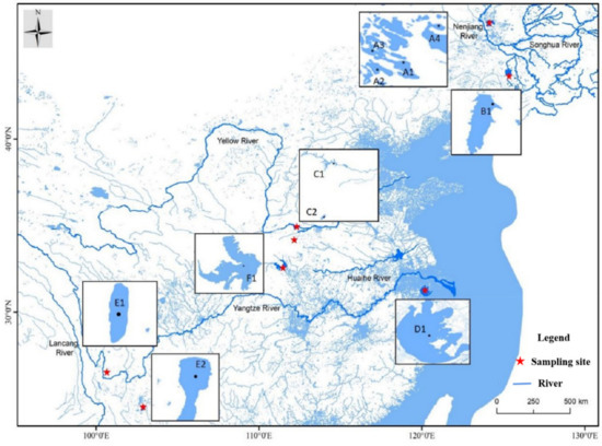 Map showing sampling locations of N. taihuensis in six different river basins in China. Note: NjRB: Nenjiang River Basin, A1 to A4 represents Huoshaohei lake (HSH), Amuta lake (AMT), Yamenqi lake (YMQ), Longhupao lake (LHP), respectively; ShRB: Songhua River Basin, B1: Xinlicheng reservoir (XLC); YeRB: Yellow River Basin, C1: Xiaolangdi reservoir (XLD), C2: Luhun reservoir (LH); YzRB: Yangtze River Basin, D1: Taihu lake (TH); LcRB: Lanchang River Basin, E1; Chenghai (CH), E2: Fuxian lake (FX) and HhRB: Huaihe River Basin, F1: Hongze lake (HZ).