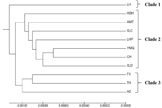 The pairwise comparisons Fst test showed that there were genetic differences among all 11 populations (Fst = −0.0916~0.5387, p < 0.05). The highest degree of genetic differentiation occurred between the TH and XLD populations (Fst = 0.5387), and the lowest degree of genetic differentiation occurred between the LH and LHP populations (Fst = −0.0916, Table 3). The UPGMA phylogenetic tree was constructed based on the genetic distance between the 11 populations. The genetic distance ranged from 0.0014 to 0.0031, and there was no significant geographical population pattern between populations. TH and XLD were the most distant (0.0031), while YMQ and XLD were the shortest (0.0014). LH was clustered into a single branch (Figure 2).