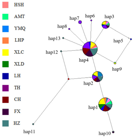 In this study, 13 different haplotypes were identified in the 197 samples (Table 1 and Table A1). The number of haplotypes ranged from two to eight in each sampled basin. The FX population possessed the highest haplotype diversity compared with the other sampled populations. The lowest number of haplotypes was found in the YMQ population, in the Nenjiang River Basin. The haplotype frequency distribution was strongly skewed; the most common haplotype H4 was found in nine sampled populations, occupying 34.01% of all individuals among five river basins. Other shared common haplotypes found in all five basins were haplotype H1, H2 and H3, with 29.95%, 19.29% and 9.64% of all individuals, respectively (Table 2 and Table A2). H4 was found in nine populations and is likely to be an ancestral haplotype. Similarly, the nucleotide diversity ranged from 0.0006 (NjRB) to 0.0034 (YeRB), with the highest value in the LH population.