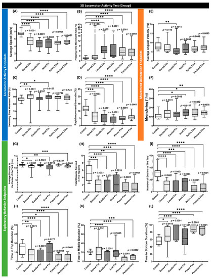 3.1. Behavior Performance of Grouped Fin-Amputated Fishes in 3D Locomotor Activity Test