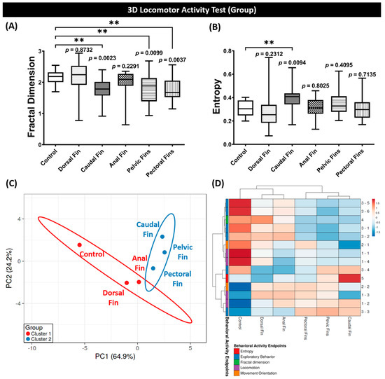 3.3. Fractal Dimension, Entropy, PCA, and Hierarchical Clustering Analyses of Grouped Zebrafish Behavior Performance after Fins Amputation