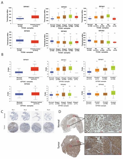 CancerSEA, available online: http://biocc.hrbmu.edu.cn/CancerSEA/home.jsp, accessed on 5 April 2022; DAVID (Database for Annotation, Visualization and Integrated Discovery), available online: https://david.ncifcrf.gov/, accessed on 22 March 2022; GSCA (Gene Set Cancer Analysis, available online: http://bioinfo.life.hust.edu.cn/GSCA/#/, accessed on 19 April 2022); the Human Protein Atlas website avalible online: https://www.proteinatlas.org/ENSG00000161960-EIF4A1/pathology, accessed on 26 March 2022; K–M plotter, available online: http://kmplot.com/analysis/, accessed on 19 March 2022; TargetScan, available online: https://www.targetscan.org, accessed on 1 April 2022; TCGA (The Cancer Genome Atlas), available online: https://portal.gdc.cancer.gov, accessed on 15 March 2022; UALCAN (The University of Alabama at Birmingham CANcer data analysis Portal), available online: http://ualcan.path.uab.edu, accessed on 15 March 2022); UCSC Xena website, available online, https://xena.ucsc.edu/, accessed on 20 March 2022.