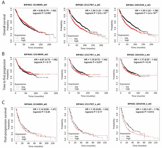 The clinical significance of EIF4A1 was evaluated using a survival analysis from the Kaplan–Meier plotter (the correlation between gene expressions and survival). Higher expression levels of EIF4A1 were linked to shorter overall survival, which was demonstrated by two out of three probes for EIF4A1 (Figure 2A). On the contrary, the EIF4A1 level was not associated with the time to first progression (Figure 2B). Regarding post-progression survival, an elevated EIF4A1 level was linked to shorter survival in one out of three probes (Figure 2C). The data suggest that higher EIF4A1 expression in a tumor may confer a survival disadvantage.