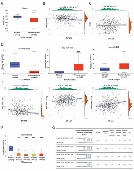 Gene expression can be regulated by epigenetic and post-translational modifications. We found DNA methylation levels to be lower in the tumor tissues and that they had an insignificantly negative correlation (r = −0.14) with EIF4A1 (Figure 3A,B). The copy number of EIF4A1 was not concordant with its mRNA expression level (Figure 3C), precluding DNA methylation and copy number variation (CNV) as the primary regulatory mechanisms of EIF4A1. The miR–RNA interaction predicted by TargetScan suggested that hsa-miR-133b, hsa-miR-142 and hsa-miR-212 were possible candidates. Among these, hsa-miR-133b was expressed in low levels in tumor tissues compared with normal tissues (Figure 3D). Moreover, the negative correlation between EIF4A1 and the curated miRs was only observed for hsa-miR-133b, but not for hsa-miR-142 and hsa-miR-212 (Figure 3E). The expression of hsa-miR-133b was also low in advanced tumor stages without any dependency on the stages (Figure 3F). The binding score for hsa-miR-133b on EIF4A1 was high (99%) (Figure 3G). These results suggest that hsa-miR-133b is a regulator of EIF4A1 in LUAD.