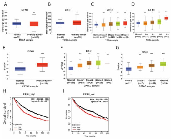 Because the activity of EIF4A is regulated by two homologous RNA-binding proteins, EIF4B and EIF4H [29], we assessed the influences of EIF4B and EIF4H on EIF4A in LUAD. As shown in Figure 4A,B, the expression of EIF4H at mRNA levels, but not EIF4B, was enhanced in the tumor tissue of patients with LUAD. The increased expression of the EIF4H gene was also positively correlated with advanced clinical stages and lymph node status (Figure 4C,D). The enhancement of EIF4H at protein expression was also observed in the tumors of LUAD patients (Figure 4E). Similarly, positive correlations between EIF4H protein and higher clinical stages or lymph node status were also illustrated (Figure 4F,G). Cross-analysis of EIF4A1–EIF4H in OS time showed that the hazard ratio (HR) of up-regulated EIF4A1 on OS declined from 1.53 (p = 3 × 10−6) to 1.31 (p = 0.0043) across LUAD patients with higher and lower EIF4H, respectively (Figure 4H,I). These data suggest that the interaction of EIF4A1 and EIF4H could affect the clinical outcome in LUAD patients.