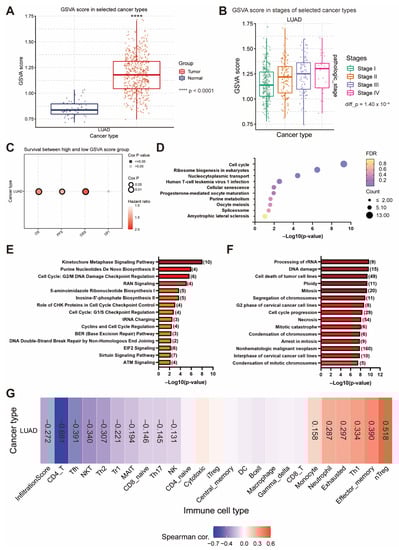 The correlation of the gene sets positively or negatively correlated with EIF4A1 was also extracted from UALCAN. The criteria in the analysis were Pearson-CC (correlation coefficient) > 0.3 and p-value < 0.05, which was calculated using UALCAN. The GSVA score of the gene sets with regards to gene expression, survival rate, and immune infiltration was calculated using GSCA (Gene Set Cancer Analysis. Available online: http://bioinfo.life.hust.edu.cn/GSCA/#/, accessed on 19 April 2022) [27].