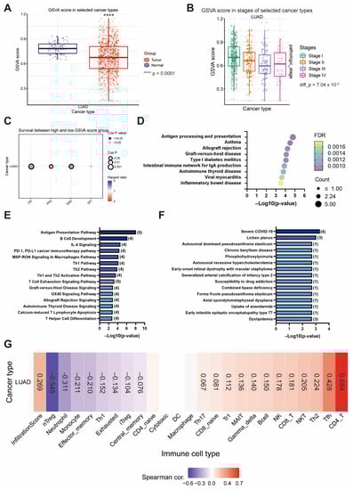 To elucidate the signaling networks suppressed by EIF4A1 upregulation, we also assessed the gene set negatively correlated with EIF4A1. The results showed that 44 genes (r < −0.3, p < 0.05) were negatively associated with EIF4A1 expression in the TCGA LUAD cohort (Table S2). The GSVA score of the gene set negatively correlated with EIF4A1 was lower in the tumor tissues (0.673 vs. 0.787, p < 0.0001) (Figure 7A). The GSVA scores decreased at stage I and then gradually decreased at stage III (Figure 7B). The prognosis analysis also indicated that a higher GSVA score in these downregulated gene sets was linked to a better prognosis, including longer OS (HR = 0.60, p = 0.0007), PFS (HR = 0.77, p = 0.039) and DSS (HR = 0.57, p = 0.004) (Figure 7C). KEGG pathway analysis revealed several immune-related pathways, such as “Antigen processing and presentation”, which was the action network of this downregulated gene set (Figure 7D). IPA analysis for the canonical pathway also supported that the gene set was associated with the “Antigen Presentation Pathway”, while several immune activation statuses, such as “Infectious Diseases”, were modulated by this downregulated gene set (Figure 7E,F). Moreover, in contrast to the upregulated gene sets, GSVA analysis of this gene set also demonstrated a positive correlation with immune cell infiltration and the abundancy of various anti-cancer immune cells (CD8_naive, Tr1, Th2, Th17, Tfh, NKT, MAIT, B cell, NK, γ-δ, CD4_T and CD8_T cells). On the contrary, immunosuppressive cells (exhausted, nTreg and iTreg) were inversely associated with the gene set (Figure 7G).