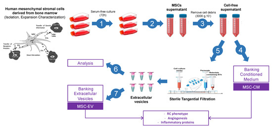 MSC-CM and MSC-EV collection. MSC-CM and MSC-EVs collection and characterization are performed in 7 distinct steps: (1) expansion, (2–3) obtain cell-free supernatants, after cell culture in serum-free medium (72 h). Cell-free supernatants divided into two parts. One part corresponding to MSC-CM (4). The second part filtered by tangential filtration for isolated MSCEV (5) and analyzed (6). (7) Banking of MSC-EV.