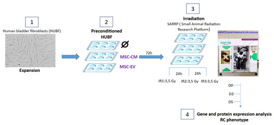 Representation of the 4 steps for obtaining an in vitro model of radiation cystitis (RC): (1) culture and expansion of HUBFs, (2) 72 h of preconditioning of HUFBs (control without conditioning (Ø)), with MSC-CM) or with (MSC-VE), (3) 3 irradiations of HUBFs at a dose of 3.5 Gy at 24 h intervals, using the Xstrahl small animal radiation research platform (SARRP), (4) harvest of supernatants and cells at 0, 2 and 5 days after last exposure (for gene and protein expression analysis).