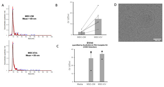 MSC-CM and MSC-EVs characterization. (A): Graph showing the calculated mean ± SD of particles size distribution of MSC-EVs and MSC-CM samples by Nanoparticles Tracking Analysis (NTA). (B): Quantification of particles present in MSC-EVs and MSC-CM samples by NTA, graph showing the calculated mean ± SD, n = 5, p = 0.0159. (C): Quantification of particles present in MSC-EVs and MSC-CM samples by ELISA specific to CD63 detection (marker of extracellular vesicles), n = 3. (D): Visualization of particles in EVs sample by cryo-electron microscopy.