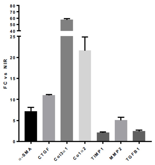 Results of the expressions of genes involved in fibrosis in irradiated HUBFs (3 × 3.5 Gy) at D5 post irradiation compared to non-irradiated HUBFs. The results were normalized to the untreated HUBFs. Gene expression profile of HUBFs after irradiation compared to non-irradiated control (NIR). FC: Fold change. The mRNA level of GAPDH gene was considered as normalizing control gene. Fold change values were evaluated using the following formula: 2−ΔΔCt, n = 6.