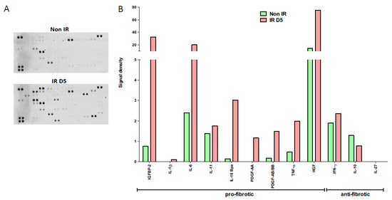 Profiling of cytokines expressed by secretomes of irradiated or non-irradiated fibroblasts obtained with Proteome Profiler Human XL cytokine Array Kit (R&D) (A) Representative image of dot blot, (B) graph showing signal density of dot blot for each protein normalized to positive spot pixels.
