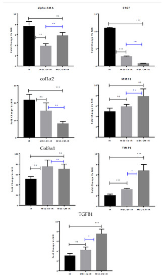 Results of gene expression of alpha-SMA, CTGF, Col1a2, MMP2, Col3α1, TIMP1 and TGFB1 in HUFBs irradiated with no treatment (IR) and HUBFs irradiated and preconditioned with MSC-EVs (MSC-EV-IR) or MSC-CM (MSC-CM-IR). Real-time PCR was used for the analysis. The mRNA level of GAPDH gene was considered as normalizing control gene. Fold change vs. NIR (Mean +/− sem), Mann–Whitney test: p > 0.05 ns, p < 0.05 *, p < 0.01 **, p < 0.001 ***, n = 6.