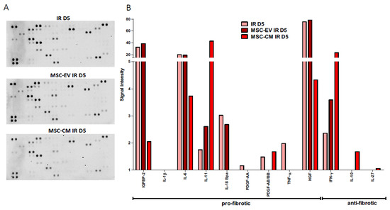 Profiling of cytokines expressed by secretomes of irradiated untreated fibroblast or preconditioned with MSC-EV or MSC-CM obtained with Proteome Profiler Human XL cytokine Array Kit (R&D). (A) Representative image of dot blot; (B) graph showing signal density of dot blot of each protein normalized to positive spot pixels.