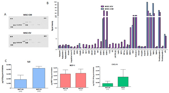 MSC-EVs and MSC-CM protein composition. (A) Profiling of angiogenesis-regulating proteins secreted by MSC-EV or MSC-CM samples obtained with Proteome Profiler Human Angiogenesis Array Kit (R&D). At the top, representative image of dot blot and at the bottom, graph showing pixel density of dot blot of each protein normalized to positive spot pixels. (B) Profiling of cytokines secreted by MSC-EV or MSC-CM samples obtained with Proteome Profiler Human XL cytokine Array Kit (R&D). At the top, representative image of dot blot and at the bottom, graph showing pixel density of dot blot of each protein normalized to positive spot pixels (C): Quantification of IL8, MCP-1 and CXCL16 secreted by MSC-EV or MSC-CM samples by ELISA (mean ± SD), n = 3.