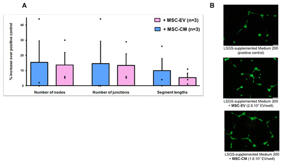 Geltrex LDEV-Free Reduced Growth Factor Basement Membrane Matrix (Gibco, 100 µL/well) was coated onto 24-well plates and cultured in a 37 °C for 30 min for matrix gel polymerization. Human umbilical vein endothelial cells (HUVEC, Gibco) were removed from culture after 7 days in LSGS-supplemented Medium 200 (Gibco), trypsinized and resuspended in LSGS-supplemented Medium 200. HUVECs (5 × 104 cell/well) were seeded into each well in different experimental conditions: LSGS-supplemented Medium 200 (positive control) or LSGS-supplemented Medium 200 with MSC-EV (2.5 × 107 VE/well) or LSGS-supplemented Medium 200 with MSC-CM (1.8 × 107 VE/well). After 12 h incubation, the cells were stained with 2 μg/mL of Calcein, AM (Invitrogen, Waltham, MA, USA) incubated for 30 min at 37 °C. Fluorescence images were captured at a 10× magnification using CKX53 brightfield and epifluorescence microscope (Olympus, Allentown, PA, USA). Number of nodes, number of junctions and segment length were counted from the collected images using the NIH ImageJ analysis software, to quantify the angiogenic network formation.