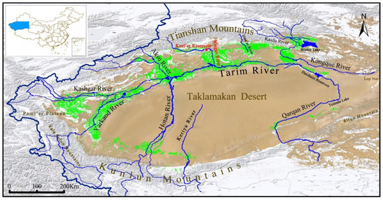 Map of Tarim River Basin. The red star indicates the sampling site of this study (Kezi’er Reservoir). The green areas in the figure indicate the main oasis within the basin. Aspiorhynchus laticeps and Schizothorax biddulphi were once widely distributed in major tributaries of Tarim River, but Weigan River (Red font) has become the last habitat of Aspiorhynchus laticeps now.
