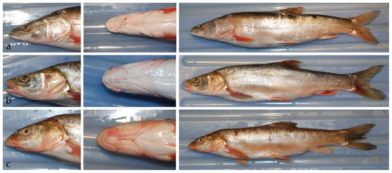 - Zolotova, A.O.; Nikitin, V.D.; Dzen, G.N. Identification of Hybrids between the Far Eastern Redfins Tribolodon hakonensis and T. brandtii Based on the Cephalic Lateral-Line System and Four Molecular Genetic Markers. J. Ichthyol. 2019, 59, 317–326. [Google Scholar] [CrossRef]